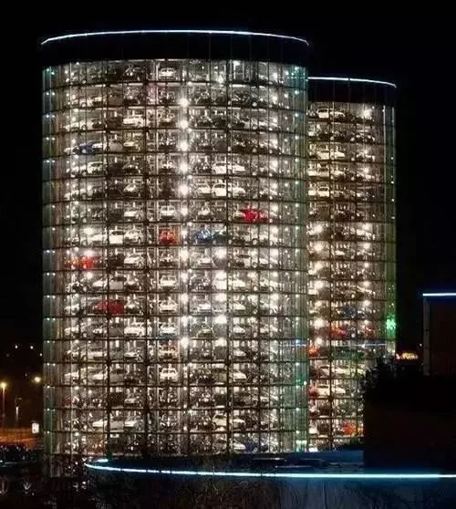 這其實是大眾德國的沃夫斯堡的停車場。兩幢圓柱形汽車塔高20層42米,每幢塔樓可以存放400輛大眾汽車。